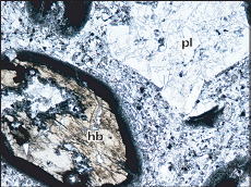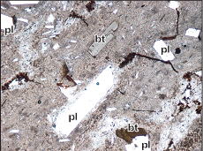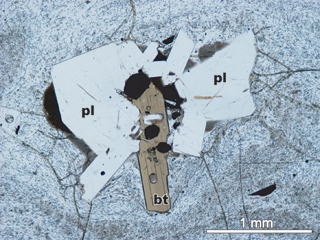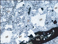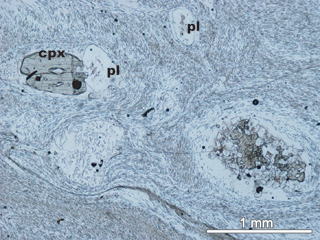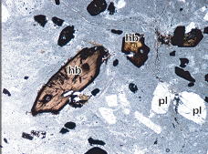 カルデラ壁やその周辺地域には,カルデラが形成される前(200万年前〜40万年前)に噴出した溶岩および火砕岩(先阿蘇火山岩類)が分布しています.先阿蘇火山岩類も,玄武岩から流紋岩まで幅広い化学組成を示しますが,どうやらカルデラ形成期や形成後の火山噴出物とは少し記載岩石学的特徴が異なるようです.下の写真は,カルデラ壁を構成する先阿蘇火山岩類の薄片写真です.三好ほか(2009)(地質学雑誌)では,これらの詳細な岩石記載を行いました.カルデラ形成期〜形成後の火山噴出物には普通角閃石斑晶がほとんど含まれないのに対し,先阿蘇火山岩類には多く含まれます.