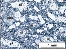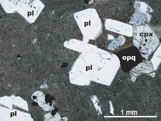 ↑左から,無斑晶質両輝石安山岩,斑状両輝石安山岩,かんらん石両輝石玄武岩.