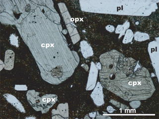 阿蘇火山には玄武岩から流紋岩まで幅広い化学組成を示す火山噴出物が分布しています.下の写真は,阿蘇カルデラ形成後に活動した中央火口丘群からの噴出物の薄片写真です.三好ほか(2005,火山)では,これらの詳細な岩石記載を行いました.