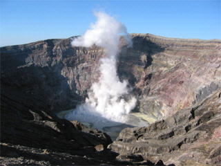 カルデラ形成後も阿蘇火山の活動は継続し,複数の成層火山やスコリア丘などからなる中央火口丘群が形成されました.現在活動中の中岳(↓左写真)も,中央火口丘群のうちの一つです.現在地表で確認できる中央火口丘群の給源火口は17個以上で,地形・火山層序によって識別できるカルデラ形成後火山噴出物は約30ユニットに及びます(小野・渡辺,1985;渡辺,2001;増田ほか,2004;宮縁ほか,2004).