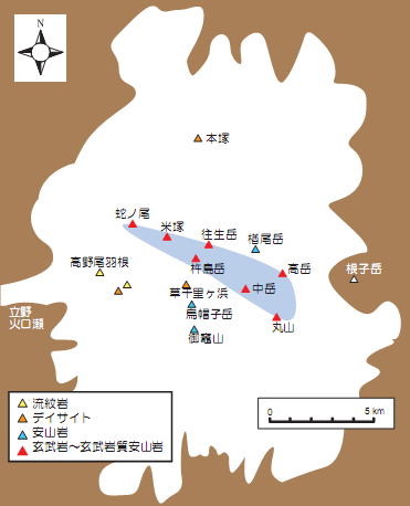 ↑火口の分布と火山噴出物の全岩化学組成との関係.