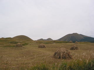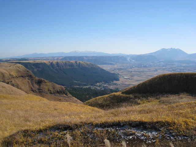 阿蘇火山は,約27〜9万年前までに4回の大規模火砕噴火(Aso-1〜Aso-4)を起こした火山です.それら噴火によって,阿蘇火山直下のマグマ溜りから膨大な量のマグマが放出され,火山体は陥没し,カルデラが形成されたといわれています(小野・渡辺,1985;阿蘇火山地質図).阿蘇火砕流堆積物の分布が山口県にまで広がっていることから,火砕流は海を渡ったと考えられています.その阿蘇火砕流に伴った火山灰(Aso-4火山灰)は,遠く離れた北海道でも確認されています(渡辺,2001;阿蘇火山の生い立ち).
