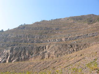 カルデラを形成した大規模火砕噴火の前(約220〜30万年前)にも,阿蘇では火山活動がありました.元あった火山体の地形こそ残されてはいないものの,阿蘇外輪山やその周辺にはカルデラ形成前の火山活動による噴出物が断片的に露出しています.噴出物は分厚い溶岩(↓右写真)が主体であることから,カルデラ形成期の大規模火砕噴火の前の火山活動は,広範囲に及ぶ溶岩流の噴出で特徴付けられそうです.それらカルデラ形成前の火山噴出物は,『先阿蘇火山岩類』(小野,1969)と呼ばれています.