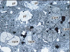 ↑左から,両輝石安山岩,かんらん石普通角閃石両輝石安山岩,かんらん石単斜輝石玄武岩.
